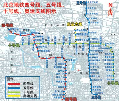 據(jù)報道,北京地鐵四號線全長28.16公里,共設(shè)24座車站,南起豐臺馬家樓,北至海淀區(qū)龍背村。北京地鐵五號線全長27.6公里,共設(shè)22座車站,南起豐臺區(qū)宋家莊,北至昌平區(qū)北太平村。北京地鐵十號線全長24.55公里,共設(shè)22座車站,南起朝陽區(qū)勁松,西至海淀區(qū)萬柳。奧運支線全長5.91公里,共設(shè)4座車站,南起熊貓環(huán)島,北至奧體森林公園。