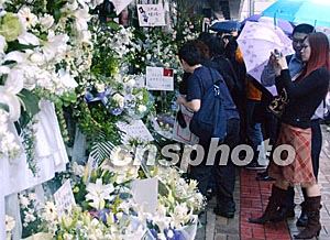 四月一日是一代歌星張國(guó)榮逝世一周年忌日,香港及海外眾多歌迷手捧鮮花冒雨來(lái)到文華酒店前,以不同方式表達(dá)對(duì)歌星張國(guó)榮的深切懷念。中新社記者:錢(qián)興強(qiáng)