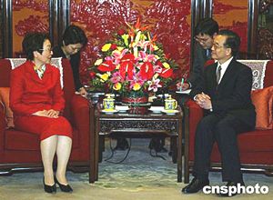 中國(guó)國(guó)務(wù)院總理溫家寶四月三日在北京中南海會(huì)見(jiàn)日本外相川口順子。中新社記者:滿(mǎn)會(huì)喬
