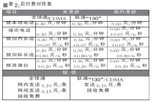 分國內漫游和未漫游兩種收費標準,具體資費標準見表2。
