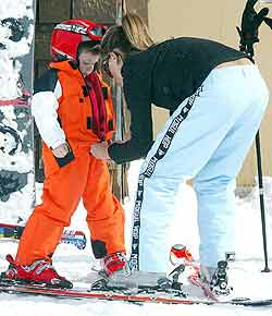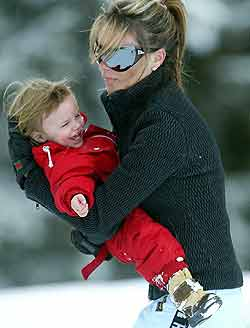 穿著一套桔黃色滑雪服的布魯克林突然開始哭起來,原來他不能從雪橇上立起身來。維多利亞彎下腰去抱了抱兒子,并幫他整理好衣服,小布魯克林又破涕為笑(見圖二)。隨后,維多利亞抱著18個月大的小兒子羅密歐在滑雪場的練習(xí)坡地慢慢滑行。維多利亞象蕩秋千一樣輕輕地晃動著小家伙,直逗得他在媽媽的懷里咯咯直笑(見圖三)。
