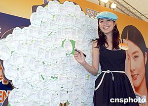歌星陳慧琳4月10日在香港出席《職業(yè)英語2004陳慧琳英語工場Fun Fun Show》,并于復(fù)活節(jié)“許愿樹”貼上祝福愿望。陳慧琳為職業(yè)英語運動宣傳大使。作者:鄧慶樂