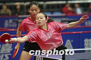 奧運乒乓球亞洲預(yù)選賽雙打比賽第二階段四月十二日晚在北京海淀體育館開賽,中國香港選手帖亞娜(前)、桑婭嬋不敵已經(jīng)獲郭躍、牛劍鋒,零比四敗北。中新社記者:盛佳鵬