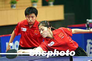 奧運乒乓球亞洲預(yù)選賽雙打比賽第二階段四月十二日晚在北京海淀體育館開賽,牛劍鋒(前)、郭躍零比四輕取中國香港選手帖亞娜、桑婭嬋,獲得六連勝,宣告成功進(jìn)軍雅典奧運。中新社記者:盛佳鵬