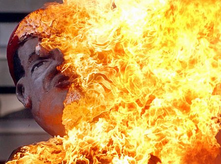 中新網(wǎng)4月13日電 據(jù)路透社報(bào)道,4月11日,委內(nèi)瑞拉總統(tǒng)查韋斯的反對者正在首都加拉加斯燃燒這位左翼領(lǐng)導(dǎo)人的肖像。兩年前的4月11日,一場短暫的政變將查韋斯暫時(shí)推翻下臺。委內(nèi)瑞拉政府和反對派相互指責(zé)對方是導(dǎo)致這場政變引發(fā)的暴亂當(dāng)中數(shù)十人死亡的罪魅禍?zhǔn)住#ù猴L(fēng))