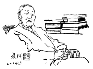 3月18日,入春后一個晴暖的日子,父親說,去看看張中行吧。先打了電話過去。當我們下午3時準時叩開張中老的家門時,他的女兒邊迎我們進屋邊說:“我父親早就在書房等著了,還問,這父子倆怎么還沒來?”在朝東的那間僅有七八平方米的書房里,張中老正安坐在書桌前的藤椅上。他看上去精神不錯,氣色也挺好。只是因近兩年行動困難而少活動,加上老年性嗜睡,臉龐有些虛胖,舉止有些遲緩。問起近況,得知剛年過九五的張中老每天尚能依杖在屋里慢慢走走,偏愛甜食,飯量已不如從前。這天,當張中老為這幅畫像題字時,感到他握筆顯得有點費力,寫出的字跡也有些抖顫。見狀,不禁生出歲月無情之嘆。自2000年擱筆后,老人最大的樂趣就是聽京戲,偶爾翻翻閑書。我隨手拿起書桌上放大鏡旁邊放著的一本刊名《開卷》的裝幀素樸的小開本雜志翻看,見上面有張中老的朋友范用等人寫的文章。由此引出張中老的一個話題。他慢慢說道:“現(xiàn)在有人辦雜志,盡愛登一些讓人讀不懂的文章。創(chuàng)辦過《讀書》雜志的范用就講,有本原來文風不錯的雜志,現(xiàn)在登的文章就連他都看不明白了,那還看它干什么!边@段話使我聯(lián)想起閱讀張中老的書,總會覺得仿佛是在和這位仁厚的老人一同負暄,聽他用淺近易懂又含蘊深厚的話語向你娓娓講述悠遠的故事和做人的道理。再問起張中老坐下的藤椅,沒想到老人對幾十年前的舊事仍記得真真兒的:“我記得是民國二十一年(1932年)買的,還記得是在離沙灘北大紅樓不遠的八面槽買的”。算算這把藤椅已伴隨他72年了。細看老人在扶手處纏繞的白塑料繩早已磨出了一片片毛茬。