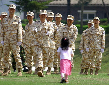 4月20日,在韓國(guó)光州舉行的赴伊拉克士兵告別儀式上,一名小女孩向他的父親告別。
