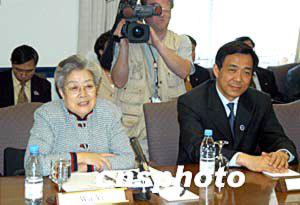 中國國務(wù)院副總理吳儀(左)和商務(wù)部部長薄熙來(右)四月二十一日出席在美國華盛頓舉行的第十五屆中美商貿(mào)聯(lián)委會(huì)。作者:余東暉