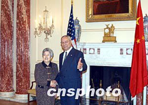 美國(guó)國(guó)務(wù)卿鮑威爾當(dāng)?shù)貢r(shí)間4月22日在美國(guó)國(guó)務(wù)院會(huì)見(jiàn)前來(lái)主持并參加中美商貿(mào)聯(lián)委會(huì)的中國(guó)國(guó)務(wù)院副總理吳儀。中新社記者:余東暉
