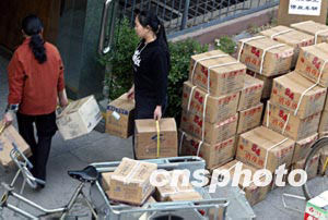北京市出現(xiàn)新的SARS疫情后,許多批發(fā)商販聞風(fēng)而動緊急進(jìn)貨SARS消毒液。四月二十三日下午,北京西城區(qū)天意市場的一家商販將新進(jìn)的“84消毒液”運(yùn)進(jìn)貨柜!84消毒液”是北京地壇醫(yī)院研制的專門殺滅肝炎病毒的消毒液,對殺滅SARS病毒有明顯效果。中新社記者:任晨鳴