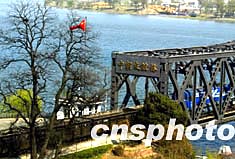 中新社今天的照片顯示,仍有滿載貨物的中國鐵路貨車通過丹東中朝友誼大橋駛?cè)氤r。