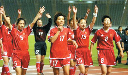 下半時15分鐘,曲飛飛接到浦瑋的傳球后,并沒有急于出腳,她在冷靜的調整、撥球后,在最合適的位置起腳,韓國隊門將金正美努力地伸出右臂,但飛飛的射門力拔千鈞。范運杰、滕巍、浦瑋興奮得恨不得把飛飛按倒在地。直到下半時35分鐘,海濤才舍得用張穎換下飛飛,因為飛飛的腿已經被對方踢得青一塊紫一塊。