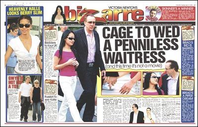 美國娛樂雜志《Bizarre》在最新一期中報(bào)道說:“尼古拉斯·凱奇將和身無分文的19歲餐廳服務(wù)生愛麗斯·金結(jié)婚。這不是電影,而是活生生的事實(shí)。”