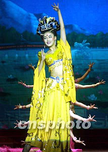 5月7日晚,陜西西安唐樂宮文藝工作者為游客表演代表中國盛唐文化的霓裳羽衣舞,為作為六朝古都的西安旅游助力。中新社記者:武仲林