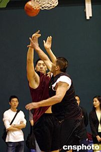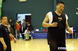五月十一日,備戰(zhàn)雅典奧運會的中國國家男子籃球隊在北京進行公開訓(xùn)練,剛剛回國的NBA球員巴特爾參加了合練。中新社記者:盛佳鵬