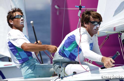 圖為當(dāng)?shù)貢r(shí)間8月18日舉行的男子雙人皮劃艇比賽中,美國(guó)選手Paul Foerster和Kevin Burnham。