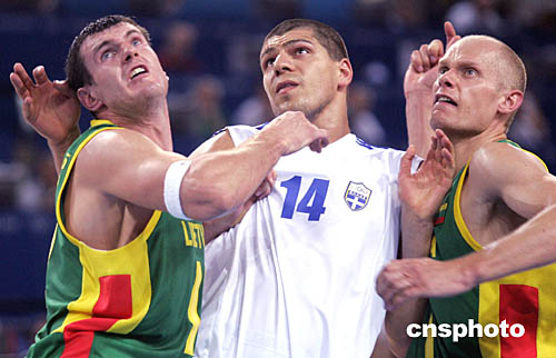 在當(dāng)?shù)貢r(shí)間8月19日舉行的男子籃球賽中,14號(hào)希臘選手Lazaros Papadopoulos被立陶宛兩名選手防住,很難脫身。