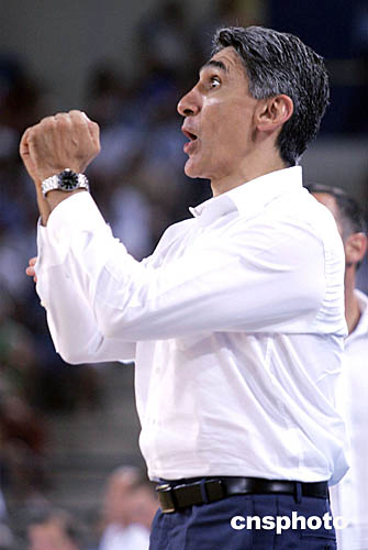 在當?shù)貢r間8月19日舉行的希臘與立陶宛的籃球比賽中,希臘隊主教練Panagiotis Giannakis不時為隊員精彩表現(xiàn)而歡呼。