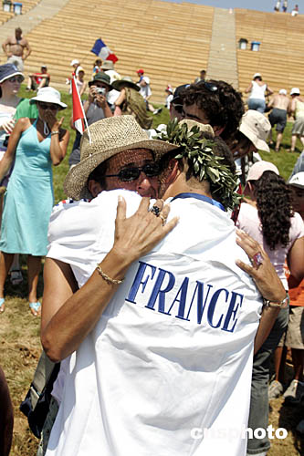 在當(dāng)?shù)貢r(shí)間8月20日舉行的急流回轉(zhuǎn)男子單人皮艇決賽中,法國選手勒弗維里獲得銅牌。圖為他與自己的母親互相擁抱慶祝勝利的畫面。