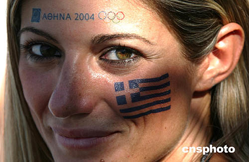 圖為在當?shù)貢r間8月20日舉行的女子50米自由泳比賽中,一位描畫著希臘國旗的支持者來為選手們加油。