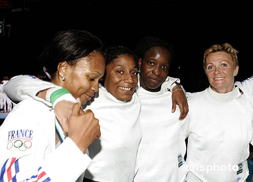 在女子重劍團體比賽中奪得銅牌后,法國隊員們登上領(lǐng)獎臺露出燦爛的笑容。