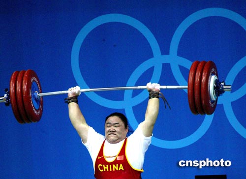 當?shù)貢r間8月21日,中國選手唐功紅在雅典奧運女子75公斤以上級舉重比賽中,打破挺舉和總成績兩項世界紀錄,奪得該項目的金牌。中新社記者:王瑤