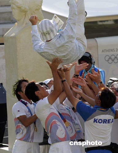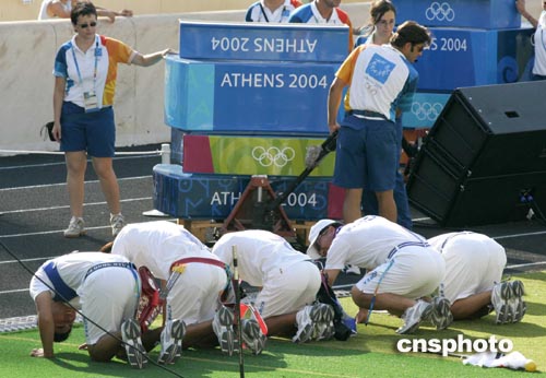 當(dāng)?shù)貢r間8月21日下午,在雅典奧運(yùn)會男子射箭團(tuán)體決賽中,韓國男子射箭隊(duì)?wèi){借強(qiáng)勁實(shí)力奪得金牌。中新社記者:張煒