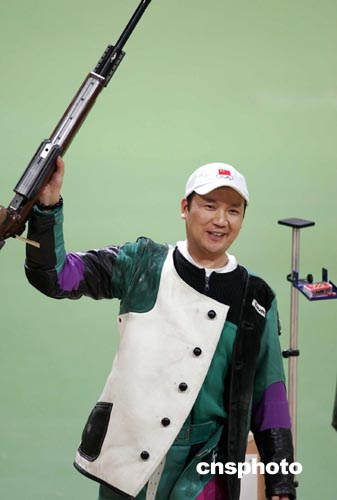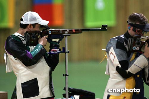 當(dāng)?shù)貢r(shí)間八月二十二日下午,在雅典奧運(yùn)會(huì)男子三乘四十射擊比賽中,中國(guó)的賈占波以一千二百六十四點(diǎn)五環(huán)的成績(jī)獲得金牌。中新社記者:毛建軍