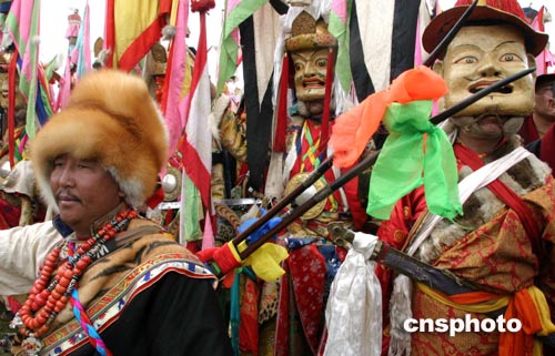 頭戴斑斕面具的藏族寺廟儀仗隊聲勢奪人。