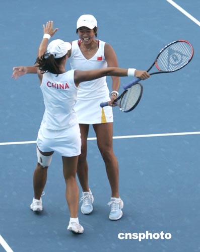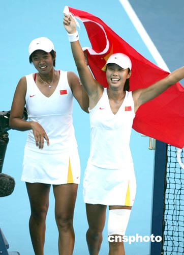 雅典時(shí)間8月22日傍晚,中國網(wǎng)球選手孫甜甜、李婷(左)在奧運(yùn)會(huì)女子雙打決賽中以二比零戰(zhàn)勝西班牙選手,令人震驚地獲得冠軍。中新社記者:任晨鳴