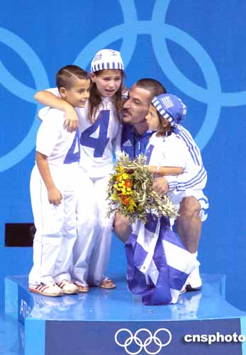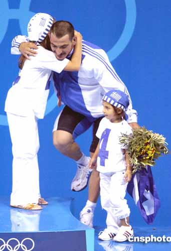 圖為當(dāng)?shù)貢r(shí)間21日進(jìn)行的男子85公斤級(jí)舉重比賽中,銅牌得主希臘選手迪馬斯與他的孩子們一起分享勝利的喜悅。