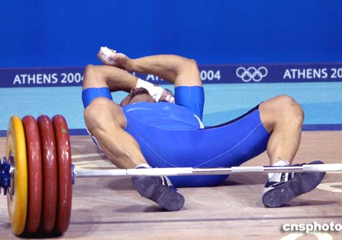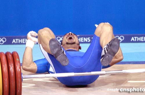 圖為85公斤級男子舉重比賽銅牌得主希臘選手迪馬斯在比賽中。