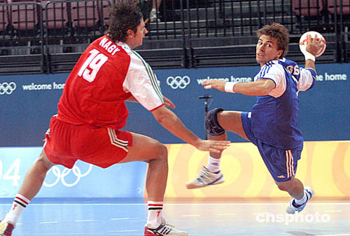 在當(dāng)?shù)貢r(shí)間8月22日舉行的男子手球賽中,匈牙利隊(duì)以26比22戰(zhàn)勝希臘隊(duì)。圖為匈牙利隊(duì)的19號(hào)選手Laszlo Zoltan NAGY。