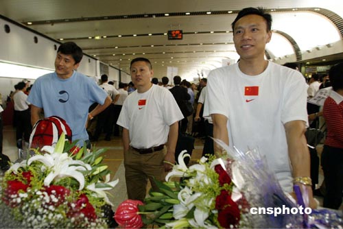 8月23日,在雅典奧運會與金牌失之交臂的中國男子花劍著名三劍客葉沖、董兆致和王海濱回到北京,在首都國際機場受到人們的熱烈歡迎。中新社記者:盛佳鵬