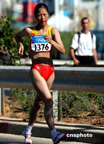 當(dāng)?shù)貢r(shí)間8月23日上午,在雅典奧運(yùn)會(huì)女子20公里競(jìng)走比賽中,中國(guó)老將王麗萍僅獲得第八名。中新社記者:張煒