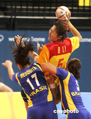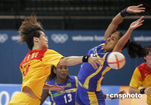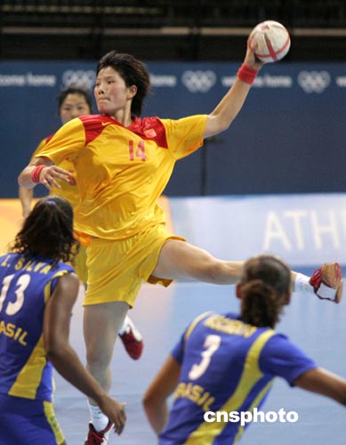 當?shù)貢r間8月23日下午,在雅典奧運女子手球比賽中,中國女子手球隊(黃)以28比23力克巴西隊。中新社記者:張煒