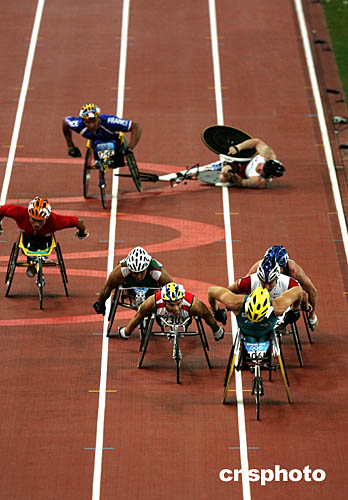 圖為在當(dāng)?shù)貢r(shí)間8月22日舉行的男子1500米輪椅表演賽中,加拿大選手Jeffrey Adams在摔倒在地后毅然爬起繼續(xù)比賽,體現(xiàn)了奧運(yùn)不屈不饒的精神。