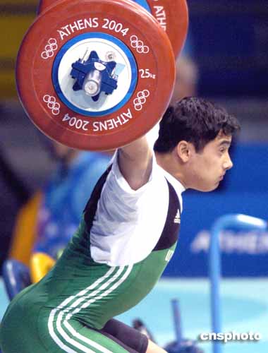 圖為當?shù)貢r間8月23日舉行的男子94公斤級舉重比賽中,一選手奮力舉起杠鈴的瞬間。