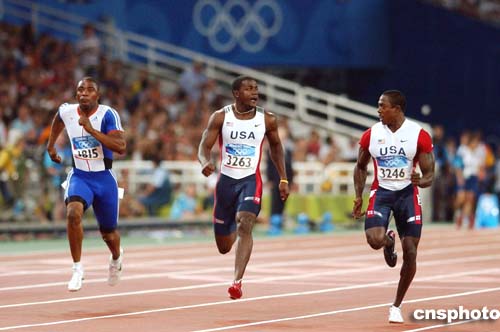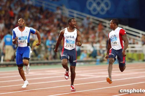 在當(dāng)?shù)貢r(shí)間22日進(jìn)行的男子100米半決賽中,美國選手Justin Gatlin和Shawn Crawford一邊比賽,一邊交談。