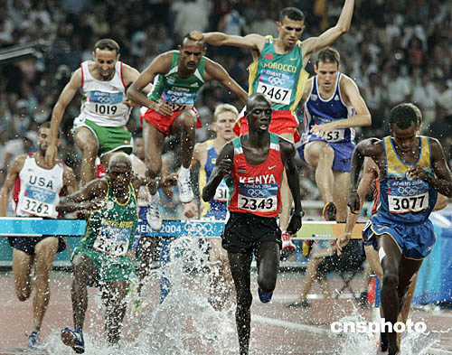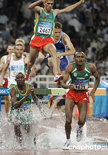 圖為在男子3000米障礙賽中,選手們的精彩表現(xiàn)。