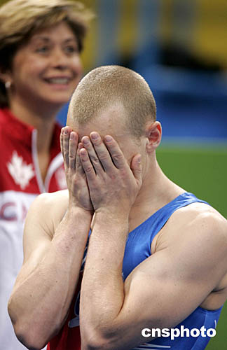 圖為加拿大選手休費(fèi)爾特(SHEWFELT Kyle)以9.787分的成績奪得男子自由體操冠軍后潸然淚下的鏡頭。