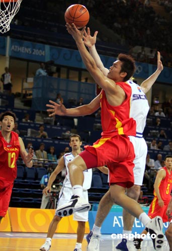 中國(guó)男籃在雅典奧運(yùn)會(huì)小組賽最后一場(chǎng)比賽中以一分險(xiǎn)勝世界冠軍塞黑隊(duì)闖入前八名,一直表現(xiàn)欠佳的首發(fā)小前鋒朱芳雨(紅衣)狀態(tài)回勇,為勝利貢獻(xiàn)不少。中新社記者:任晨鳴