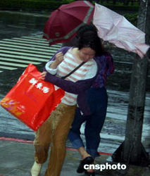 臺(tái)風(fēng)“艾利”影響驚人,八月二十四日臺(tái)灣各地普降豪雨,并有險(xiǎn)情、災(zāi)情傳出。圖為臺(tái)北市風(fēng)大雨大,行人雨傘翻了蓋。中新社記者:董會(huì)峰