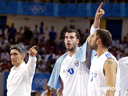 圖為在當地時間8月23日舉行的男子籃球賽希臘對陣波多黎哥中,希臘教練Panagiotis GIANNAKIS指揮隊員們比賽的場景。