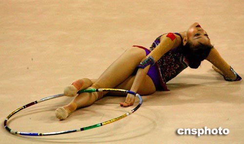 2002年釜山亞運會團體及個人全能冠軍鐘玲,當?shù)貢r間24日參加藝術(shù)體操賽前排練,她將代表中國隊出戰(zhàn)雅典奧運會藝術(shù)體操個人全能比賽。中新社記者:王瑤