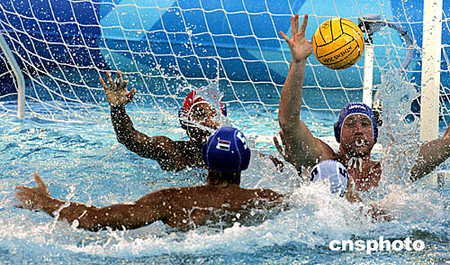 圖為在當(dāng)?shù)貢r間8月23日舉行的埃及隊(duì)和西班牙隊(duì)的水球比賽畫面。