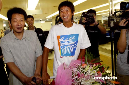 8月25日,在雅典奧運(yùn)會(huì)奪得女子網(wǎng)球雙打冠軍的李婷、孫甜甜載譽(yù)回京,在北京首都國(guó)際機(jī)場(chǎng)受到熱烈的歡迎。中新社記者:盛佳鵬