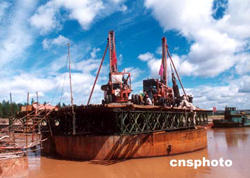8月下旬,中鐵十四局集團(tuán)三公司的工人們在呼準(zhǔn)鐵路黃河特大橋施工現(xiàn)場加緊作業(yè)。呼(呼和浩特)準(zhǔn)(準(zhǔn)格爾)鐵路全長117公里,它的建設(shè)將為中國重要的能源工業(yè)基地----鄂爾多斯市的煤炭資源運(yùn)輸開辟可靠的渠道,促進(jìn)內(nèi)蒙古西部地區(qū)的經(jīng)濟(jì)發(fā)展。呼準(zhǔn)鐵路黃河特大橋是全線重點(diǎn)工程,主體工程預(yù)計(jì)2005年10月底完成。作者:孔祥文