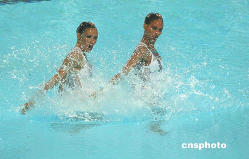 當(dāng)?shù)貢r(shí)間8月24日晚,埃及隊(duì)在雅典奧運(yùn)會(huì)進(jìn)行雙人花樣游泳比賽。中新社記者:王瑤