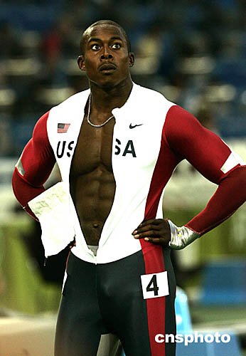 圖為美國選手克勞福德(CRAWFORD Shawn)和加特林(Justin Gatlin)在男子200米預賽中,沖過終點后向左看積分牌的鏡頭。